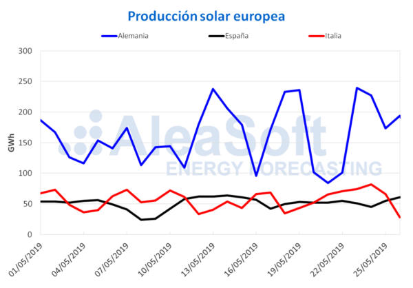 En la semana recién finalizada la producción solar, que incluye la tecnología fotovoltaica y la termosolar, sufrió una reducción del 17% y 5% en Alemania y España respectivamente, mientras que aumentó en Italia un 25%. Para la semana actual, en AleaSoft se espera que la producción solar tenga un ligero aumento en Alemania y España, y una pequeña disminución en Italia.