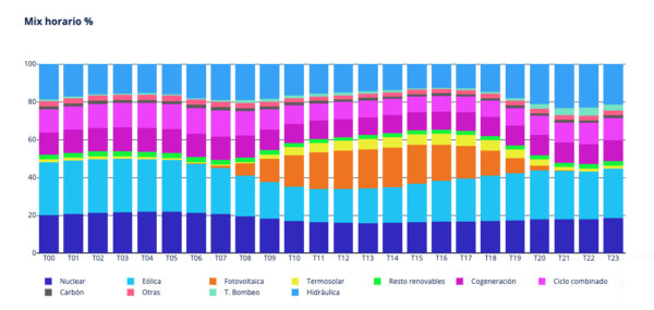 La producción fotovoltaica continúa aumentando su presencia y su producción crece un 84% respecto al mismo mes del año pasado. Lo destacan los analistas de Grupo ASE en la siguiente gráfica, donde se muestra la participación de las diferentes tecnologías en mayo. Se puede apreciar que la generación fotovoltaica se erige como la principal tecnología del mix en las horas centrales del día. En concreto, entre las 11:00 y 15:00 horas la producción fotovoltaica supone algo más del 20% del mix.