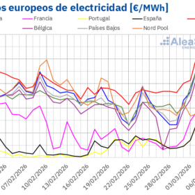 Los períodos de baja producción renovable combinados con el aumento de la demanda por calefacción intensifican la subida de precios, y el conflicto ha llevado el TTF a alrededor de 50 €/MWh, cerca de un 50% por encima del promedio de enero-febrero, impulsando los precios baseload hasta 150-160 €/MWh en Italia y Alemania, aproximadamente un 45% más que en febrero.