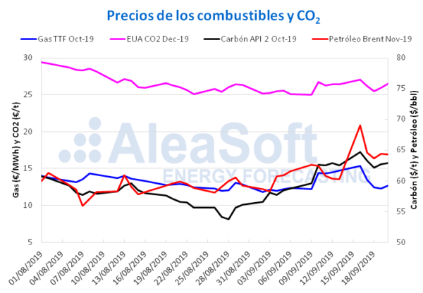 Por lo que respecta a los futuros de derechos de emisión de CO2 en el mercado EEX para el contrato de referencia de diciembre de 2019, después de la caída de precios experimentada durante los primeros días de la semana pasada, el jueves 19 de septiembre estos comenzaron a recuperarse. Con unos aumentos diarios en torno al 2,1%, al cierre de la sesión del viernes 20 de septiembre, el precio fue de 26,53 €/t, un 0,5% superior al precio alcanzado el viernes 13 de septiembre.