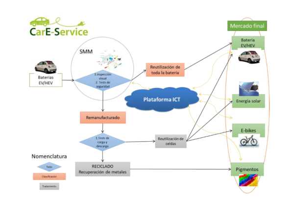 En el proyecto CarE-Service (Circular Economy oriented services for re-use and remanufacturing of hybrid and electric vehicles components through Smart Mobile Modules (SMM)), correspondiente al programa de investigación e innovación Horizonte 2020 de la Unión Europea, participan 15 entidades pertenecientes 7 países diferentes, entre los que se cuenta la empresa dedicada al reciclado de todo tipo de baterías Envirobat España.