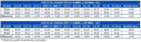 Pese a este ligero descenso de precios, el precio promedio del 27 al 30 de julio, de 38,09 €/MWh para ambos mercados, fue el segundo más elevado de Europa, después del promedio del mercado italiano. En este período, los precios diarios de España y Portugal tuvieron valores comprendidos entre los 35,89 €/MWh del martes 28 y los 40,45 €/MWh del jueves 30 de julio.