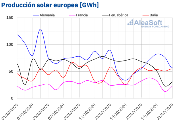La producción solar promedio entre el lunes y el miércoles de la cuarta semana de octubre, aumentó un 23% en el mercado alemán y un 19% en el mercado italiano en comparación con el promedio de la semana anterior. Por el contrario, en la península ibérica disminuyó un 51% y en el mercado francés un 22%.