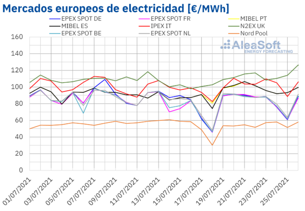 Durante la cuarta semana de julio, los precios diarios superaron los 100 €/MWh en los mercados británico, italiano, español y portugués. El precio diario más elevado, de 116,89 €/MWh, se alcanzó el jueves 22 de julio en el mercado británico. Sin embargo, en el mercado N2EX, este precio fue superado por el del lunes 26 de julio, de 126,34 €/MWh, el más alto en este mercado desde el 15 de enero.