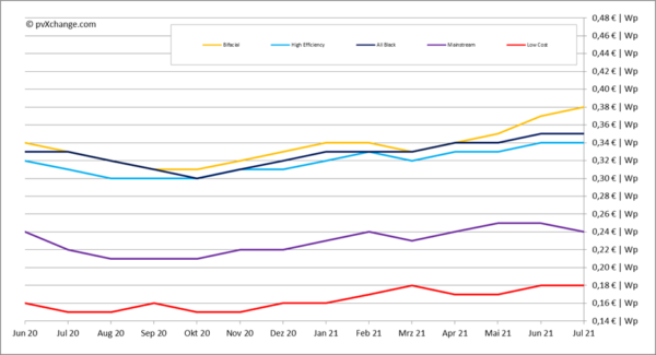 The sky is the limit. Afortunadamente, este dicho no se aplica a los precios actuales de los módulos fotovoltaicos. Tras una subida continua desde principios de año, finalmente se han tomado un respiro. Por el momento es difícil saber si esta situación se prolongará o si los precios volverán a bajar en los próximos meses. Al menos los precios del silicio y, por tanto, también los de las obleas y las células, están expuestos a un ligero descenso de los precios. Sin embargo, no cabe esperar un movimiento decisivo en los precios generales de los módulos antes del cuarto trimestre. Que sea al alza o a la baja depende en gran medida de la evolución del mercado internacional. Si la cuarta ola (en algunos países, quinta) de la pandemia, provocada por la variante Delta del virus Covid 19, puede detenerse o mitigarse a tiempo, las cosas deberían ir bastante bien por el lado de la oferta y la demanda. Sin embargo, si esto no tiene éxito, volverán a aumentar las restricciones en la producción asiática y en el resto de la cadena de suministro, lo que hará imprevisible el desarrollo del mercado.