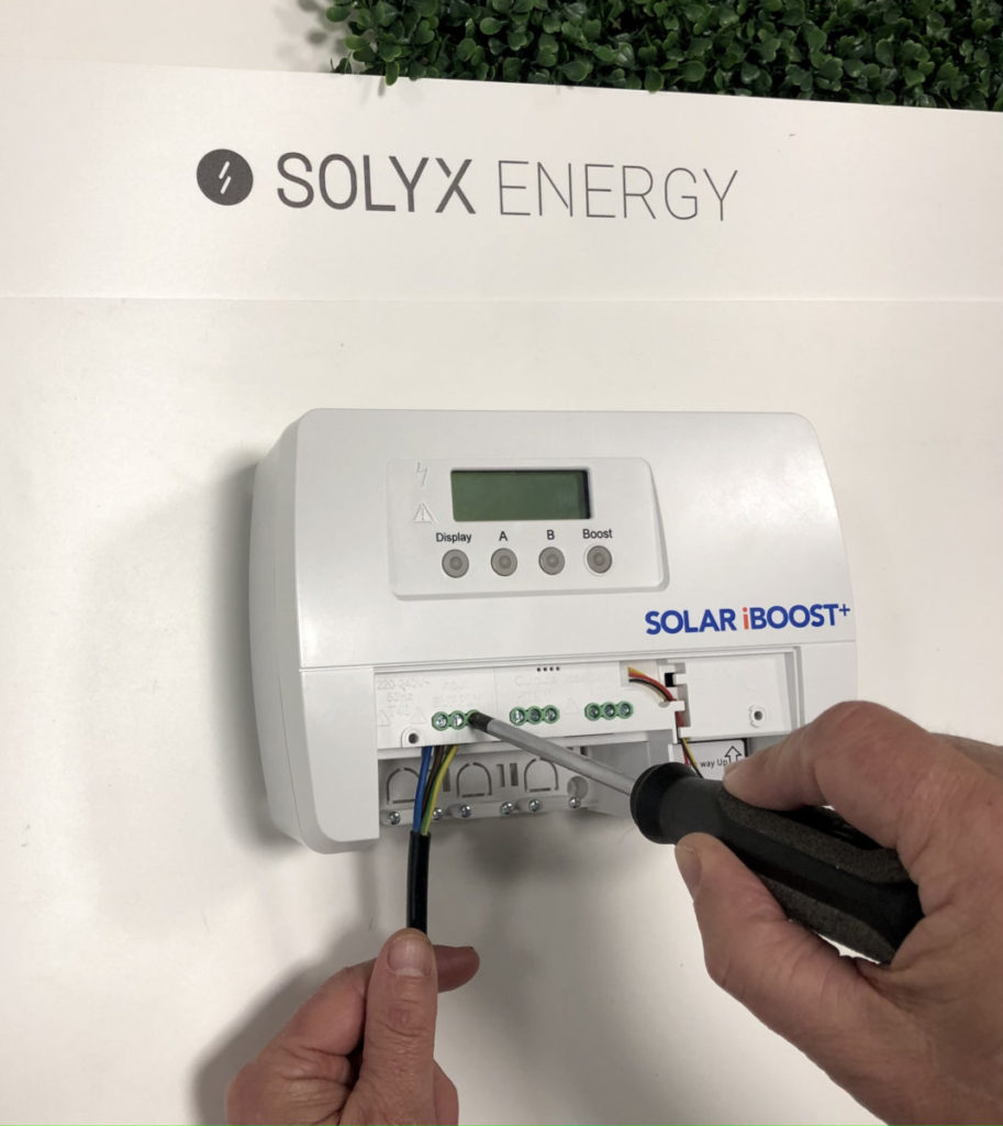 El Solar iBoost se conecta a un calentador de agua eléctrico. Tiene un rango de tensión de 220 V a 240 V, una carga máxima de 3 kW y pesa 1,36 kg. El regulador regula la cantidad de energía suministrada al calentador de agua al valor exacto medido por el sensor. De este modo, no se produce ninguna exportación de energía solar a la red.