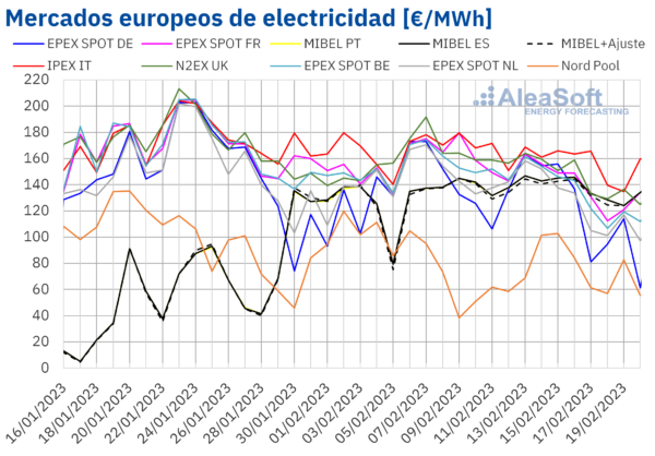 Fuente: Elaborado por AleaSoft Energy Forecasting con datos de OMIE, EPEX SPOT, Nord Pool y GME.