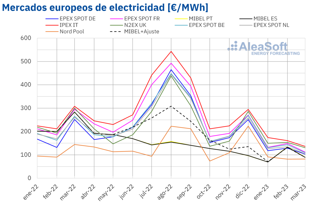 Fuente: Elaborado por AleaSoft Energy Forecasting con datos de OMIE, EPEX SPOT, Nord Pool y GME.