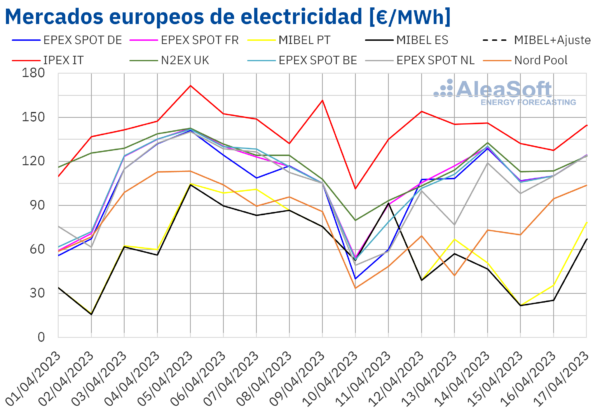 Fuente: Elaborado por AleaSoft Energy Forecasting con datos de OMIE, EPEX SPOT, Nord Pool y GME.