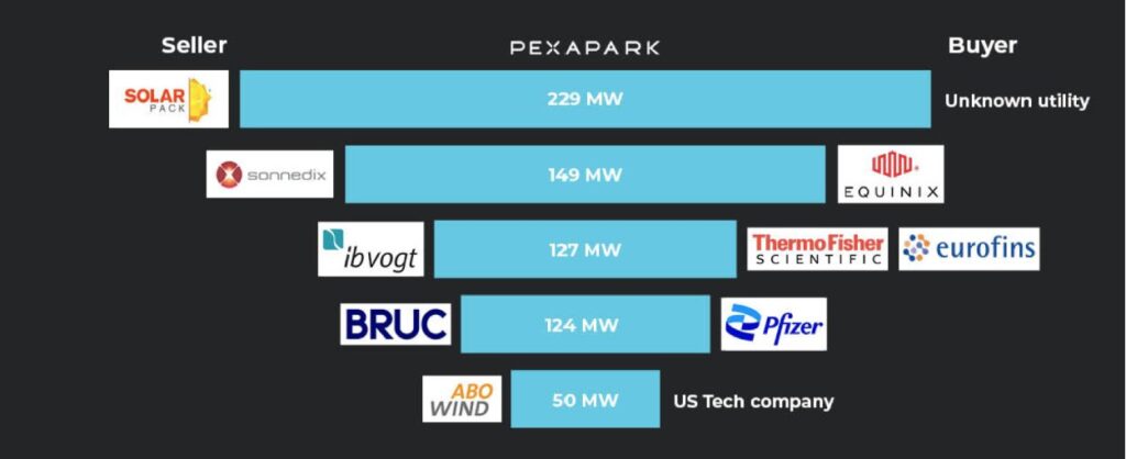 Los cinco mayores acuerdos PPA en 2023 se dividieron entre España y Alemania, marcando la primera vez que Alemania ha aparecido en la lista de los cinco principales acuerdos. Pexapark dijo que los activos fotovoltaicos representaron la mayor parte de los acuerdos más grandes por primera vez, con la tecnología representando más del 80% de un total de 3 GW en los cinco acuerdos más grandes.