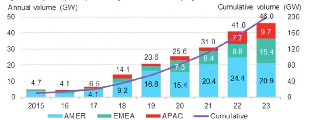 Entre 2022 y 2023, Europa vio crecer sus volúmenes de PPA corporativos un 74 % hasta 15,4 GW, con diferencia el mayor crecimiento de cualquier región. BloombergNEF dijo que a medida que “los problemas de la cadena de suministro disminuyeron y los balances de gas se normalizaron luego de la crisis energética de la región en 2022, los precios de los PPA corporativos en la región cayeron, a menudo más rápido que los precios de la energía”.