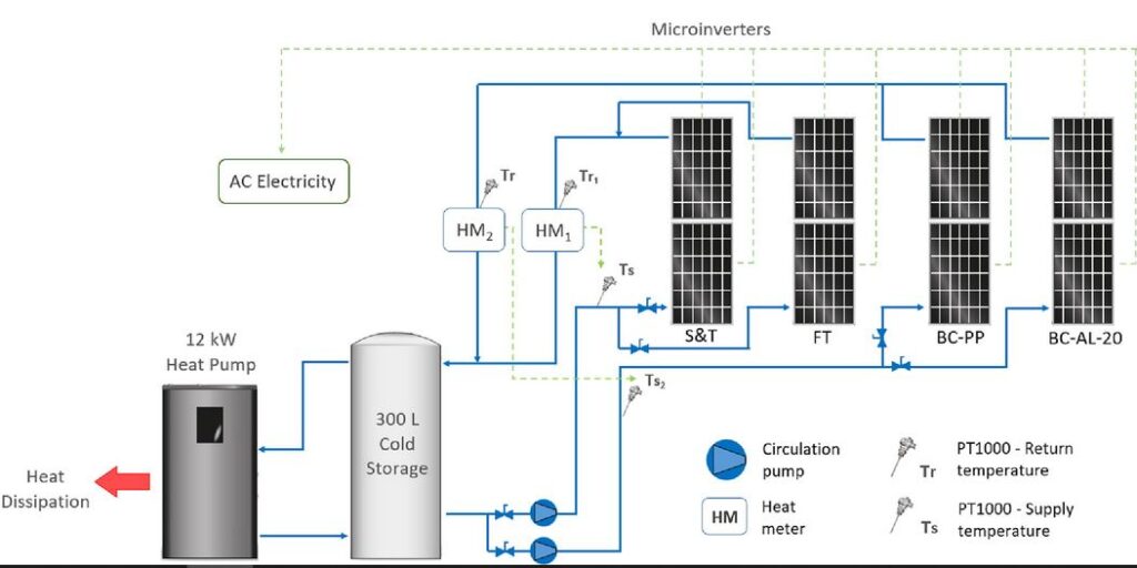 El sistema incluía un acumulador de agua caliente y un intercambiador de calor aire-agua de 10 kW para disipar el calor generado por la bomba de calor. El rendimiento del sistema se comparó con el de un sistema de referencia con colectores PVT convencionales.