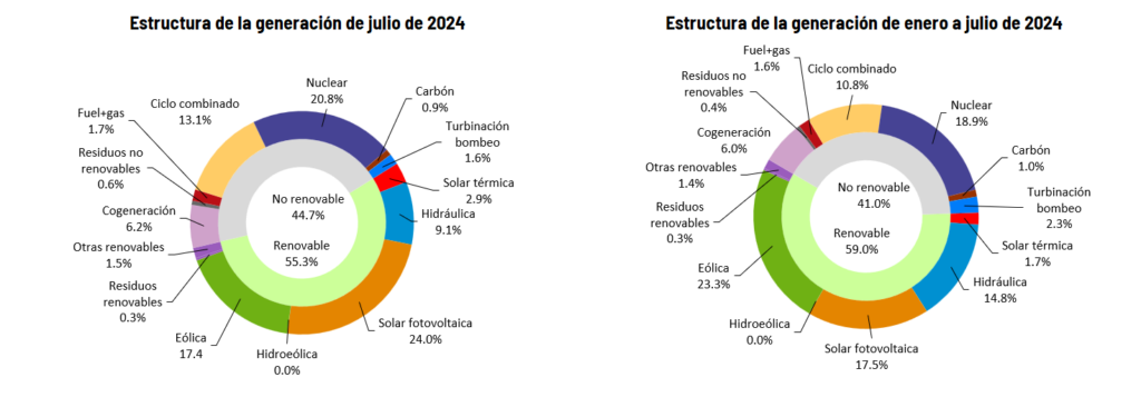 Con este impulso de las renovables, el 77,2% de la electricidad producida en España durante el mes de julio de 2024 fue libre de emisiones de CO2 equivalente.