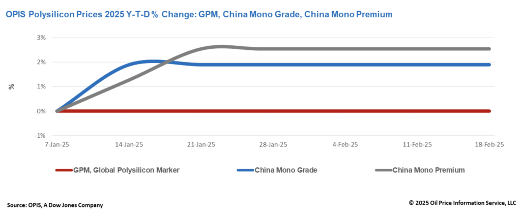 El China Mono Grade, la valoración de OPIS de los precios del polisilicio monogrado dentro del país, se mantuvo estable esta semana en 33,625 CNY (4,63 $)/kg, equivalente a 0,076 CNY/W. Del mismo modo, la China Mono Premium, la evaluación de precios de OPIS para el polisilicio monogrado utilizado en la producción de lingotes de tipo n, se mantuvo estable en 40,375 CNY/kg, o 0,091 CNY/W.