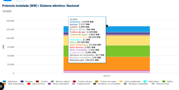 En lo que va de 2025, las renovables han generado el 56,8% del mix, lideradas por la eólica (41.593 GWh, el 20,4%), la fotovoltaica (40.878 GWh, el 20,0%), la nuclear (39.774 GWh, el 19,5%), el ciclo combinado (31.553 GWh, 15,5%) y la hidráulica (26.764 GWh, el 13,1%).