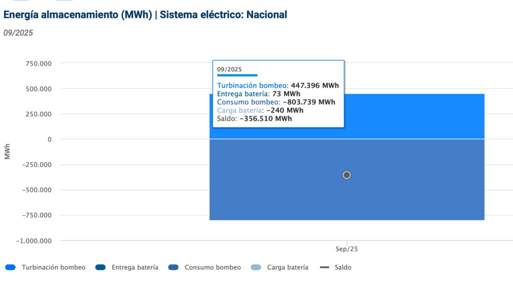 Según los datos dados a conocer por Red Eléctrica, las tecnologías de almacenamiento permitieron en septiembre la integración de 804 GWh en el sistema eléctrico español, optimizando así un mayor aprovechamiento de la energía generada mediante tecnologías renovables. Por otra parte, 675 GWh se han programado para exportar energía a nuestros países vecinos.