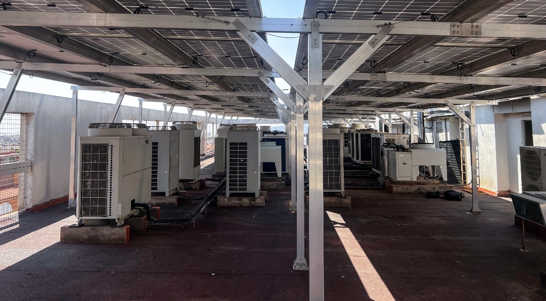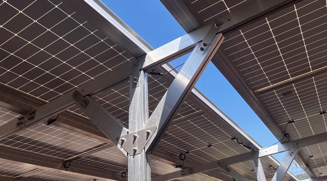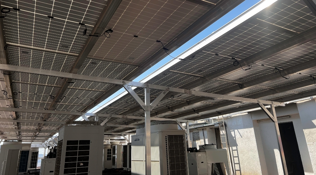 La instalación cuenta con 100 kW de conexión a red y 110 kWp de potencia fotovoltaica. Se han instalado 200 módulos fotovoltaicos del fabricante asturiano Exiom, modelo EX550MB-144 de 550 Wp, con una superficie de captación de 2,60 m². La planta se ha ejecutado sobre la azotea del edificio. Para ello se ha diseñado una estructura de aluminio a medida, de manera que los módulos fotovoltaicos forman una pérgola en la azotea. En la fabricación de las estructuras a medida se ha contado con la colaboración del fabricante catalán C-Solar.