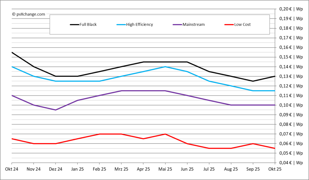 Si se observan los precios de los módulos, los precios de las diferentes clases tecnológicas suben un poco y luego vuelven a bajar, sin que se aprecie una tendencia clara. En el mejor de los casos, las fluctuaciones de precios reflejan la situación actual de la demanda: el sector de las pequeñas instalaciones está en declive, por lo que disminuyen las ventas de módulos all black. Las empresas EPC y los fabricantes se centran más en los segmentos de instalaciones fotovoltaicas medianas y grandes, donde se utilizan cada vez más módulos de alta eficiencia, pero donde también existe una gran presión en cuanto a precios y competencia.
