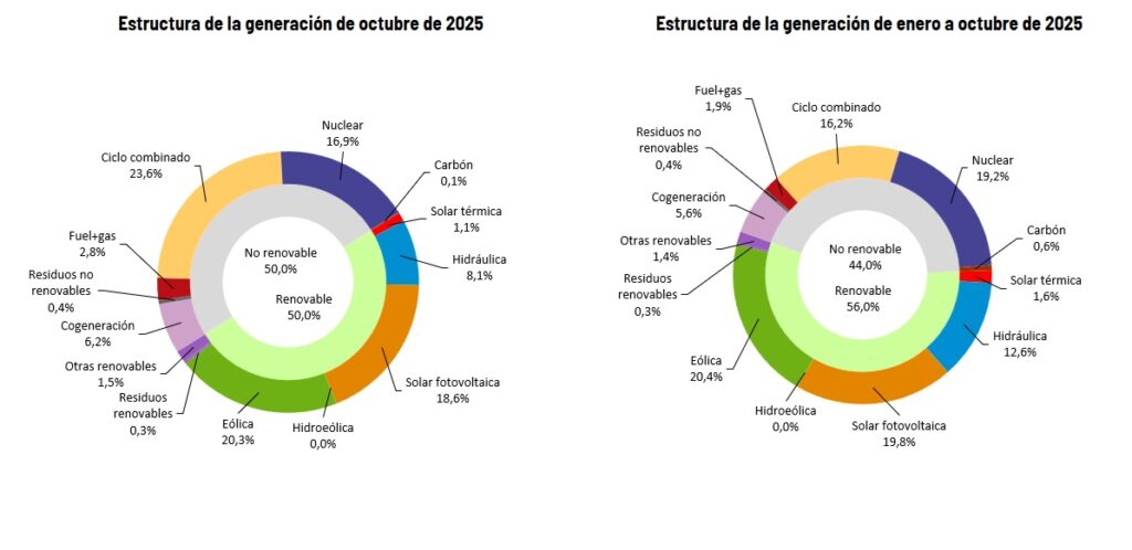 Volviendo al pasado mes de octubre, la eólica ha sido la segunda fuente, con una generación de 4.439 GWh, que supuso el 20,3 % del mix. Por detrás, se encuentra la solar fotovoltaica, con una producción mensual de 4.065 GWh, un 45,3% más que en el mismo periodo del año anterior, que alcanza una cuota sobre la estructura de generación del 18,6%. La nuclear ocupa el cuarto puesto, con el 16,9%.