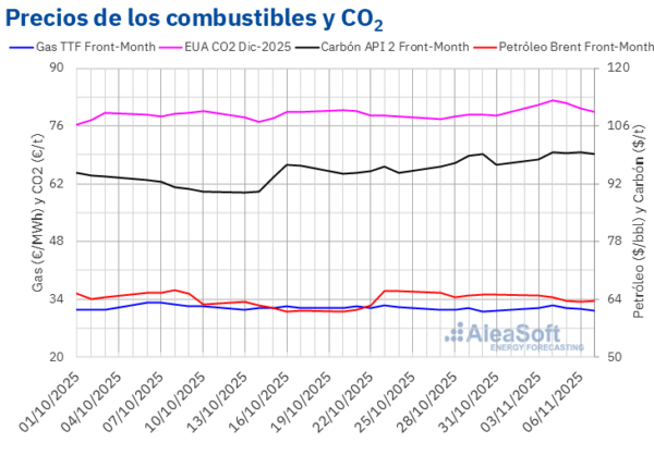 En la primera semana de noviembre, el aumento de la demanda eléctrica, el descenso de la producción eólica en algunos mercados y el incremento de los precios del CO₂, cuyos futuros alcanzaron su precio de cierre más alto desde mediados de febrero, por encima de 82 €/t, impulsaron al alza los precios en gran parte de los principales mercados eléctricos europeos. En cambio, el incremento de la producción eólica en la península ibérica favoreció el descenso de los precios en el mercado MIBEL. Además, la producción fotovoltaica alcanzó récords para día de noviembre en en los principales mercados europeos.