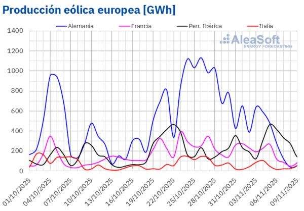 Durante la primera semana de noviembre, la producción eólica aumentó en los mercados de la península ibérica en comparación con la semana anterior, revirtiendo la tendencia a la baja de los siete días previos. El mercado español registró el mayor incremento, del 42%, mientras que en el mercado portugués aumentó un 35%. En cambio, los mercados italiano, francés y alemán prolongaron los descensos por segunda semana consecutiva, con caídas del 14%, 37% y 55%, respectivamente.