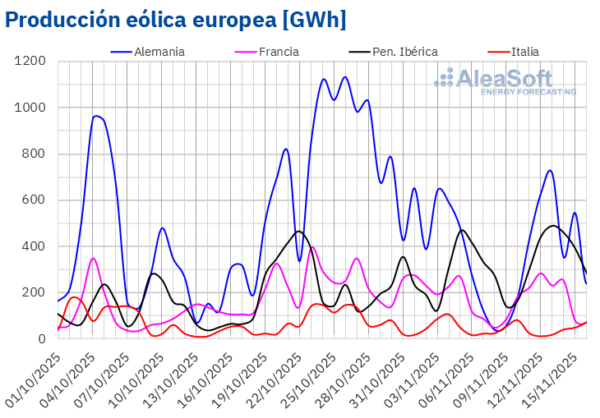En la segunda semana de noviembre, la producción eólica aumentó en la mayoría de los principales mercados de electricidad de Europa en comparación con la semana anterior. Los mercados de la península ibérica encadenaron dos semanas de incrementos. El mercado portugués registró el mayor incremento, del 53%, mientras que el mercado español presentó el menor aumento, del 17%. En los mercados de Francia y Alemania, la generación con esta tecnología aumentó un 29% y un 40%, respectivamente. En cambio, el mercado italiano mantuvo la tendencia descendiente por tercera semana consecutiva, con una bajada del 18%.