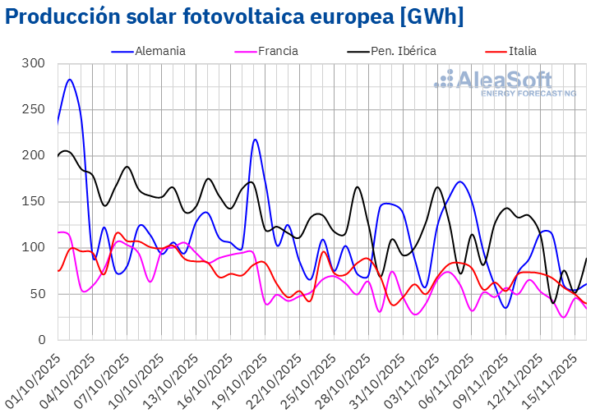 Para la semana del 17 de noviembre, según las previsiones de producción solar de AleaSoft Energy Forecasting, la producción fotovoltaica aumentará en el mercado español, pero se espera que descienda en los mercados italiano y alemán.