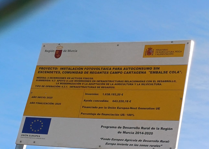 La Comunidad de Regantes del Campo de Cartagena ha puesto en marcha el proyecto “Instalación de cubierta fotovoltaica flotante para autoconsumo en el embalse Cola”.