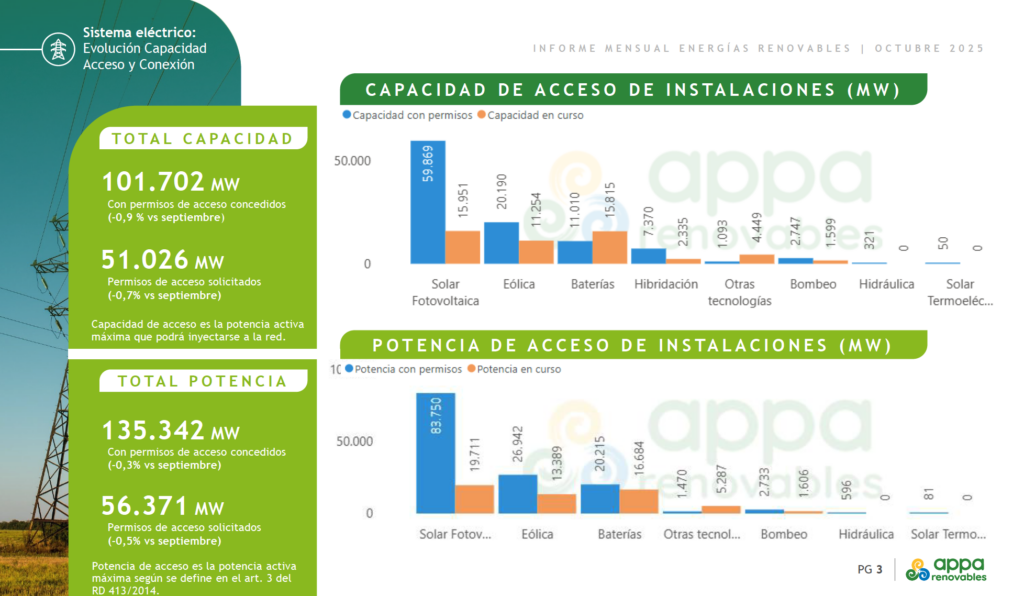 La Asociación de Empresas de Energías Renovables (APPA) ha publicado su informe mensual sobre energías renovables correspondiente a octubre, mes que registró una dinámica marcada por el incremento de precios en los mercados de energía y servicios de ajuste, una contribución renovable significativa y señales claras de congestión en determinados nudos del sistema. El precio promedio de los servicios de ajuste se situó en 18,52 €/MWh, un 27,55% superior al de octubre de 2024, aunque muy por debajo del máximo anual alcanzado en mayo (27,27 €/MWh). En el mercado diario, el precio medio fue de 75,91 €/MWh, lo que supone un aumento del 24,47% interanual. La estructura intradiaria mostró una elevada volatilidad: el precio horario mínimo alcanzó 25,03 €/MWh a las 15:00, mientras que el máximo se registró a las 20:30, con 134,21 €/MWh.