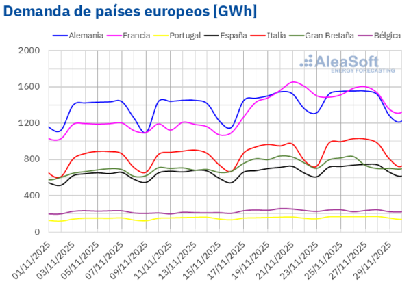 En la semana del 24 de noviembre, la demanda eléctrica aumentó en los principales mercados europeos situados geográficamente más al sur y disminuyó en los situados al norte. En los mercados italiano, español y portugués la demanda creció un 5,3%, 4,3% y 4,0%, respectivamente. En los mercados británico y belga las caídas fueron de 3,9% y 3,2% en cada caso. En un punto intermedio se encuentran los mercados francés y alemán, el primero con una caída de la demanda de un 1,1% y el segundo con un aumento de la misma de un 0,2%. Estos descensos revirtieron la tendencia alcista de todos los mercados de la semana anterior.