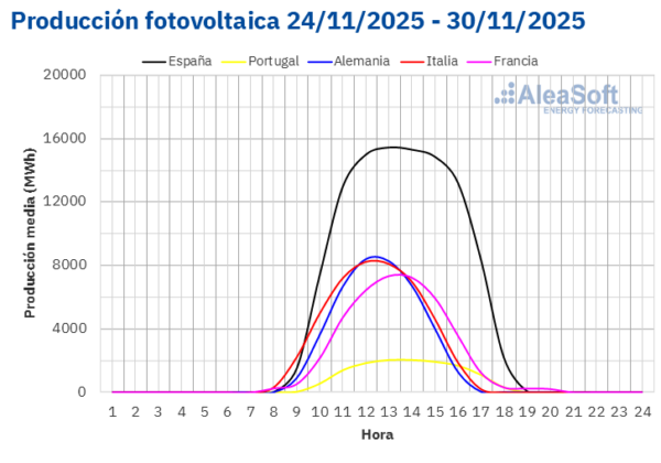 El día 24 hubo una caída en la producción en los mercados analizados, siendo para Alemania e Italia el día de menor producción solar en todo el mes. Aun así, el mes de noviembre recién concluido fue récord en producción fotovoltaica comparado con el mismo período en los años anteriores en los principales mercados.