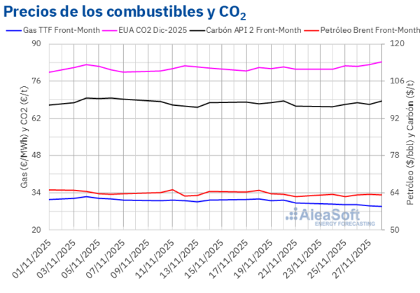 En la última semana de noviembre, los precios semanales se mantuvieron por encima de 95 €/MWh en gran parte de los principales mercados eléctricos europeos, con excepciones en los mercados ibérico, francés y nórdico. Además, varios mercados marcaron máximos diarios de los últimos meses. La producción eólica aumentó en gran parte de los mercados mientras que la fotovoltaica descendió. El 28 de noviembre los futuros de gas TTF alcanzaron el precio de cierre más bajo desde mayo de 2024 y los del CO2 el más alto desde inicios de febrero.