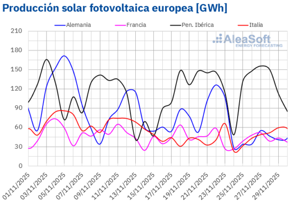 Los días 24 y 25, al contrario que con la producción solar, fueron días de alta producción eólica, llegando a ser los días de más producción en todo el mes para España e Italia, respectivamente. La excepción fue Alemania, que registró su segundo mínimo mensual el día 25. La producción del mes de noviembre aumentó en casi todos los principales mercados europeos en comparación con el mismo período del año anterior, excepto en Portugal.