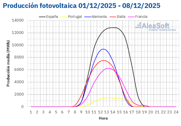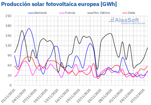 A pesar de los descensos, la mayoría de los mercados alcanzaron récords de producción solar fotovoltaica para un día de diciembre de la historia. El lunes 1 de diciembre, los mercados de España, Alemania, Francia y Portugal lograron sus máximos de generación fotovoltaica diaria para un diciembre, con 117 GWh, 85 GWh, 49 GWh y 14 GWh, respectivamente. Por su parte, el mercado italiano registró su producción solar fotovoltaica más alta para un diciembre, el lunes 8, con 58 GWh.