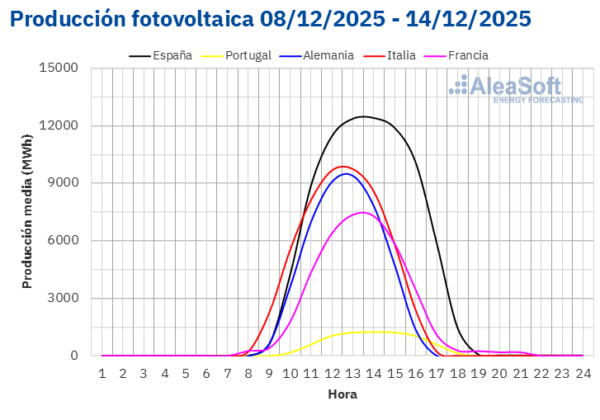 Durante la semana del 15 de diciembre, según las previsiones de producción solar de AleaSoft Energy Forecasting, la producción fotovoltaica aumentará en el mercado alemán, mientras que se espera un descenso en los mercados italiano y español.