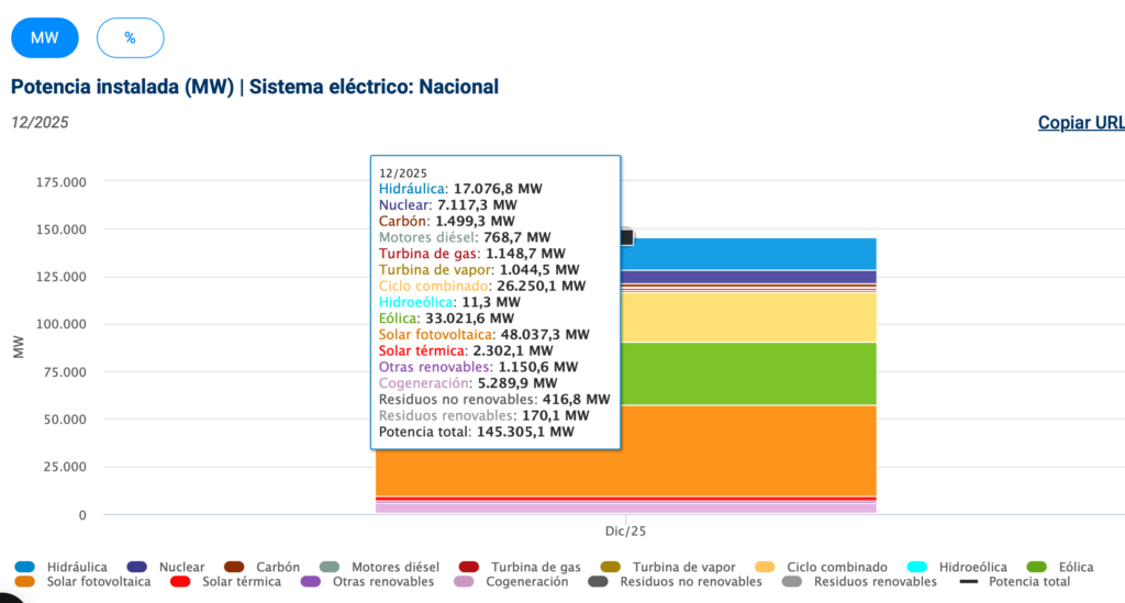 En términos de capacidad instalada, la potencia renovable superaría los 93 GW al cierre del ejercicio, lo que representa más del 68% de la potencia total del parque de generación. Al incorporar el autoconsumo, la potencia renovable excedería los 100 GW y alcanzaría el 70% del total nacional. La solar fotovoltaica continuaría como la tecnología con mayor capacidad instalada, seguida de la eólica.