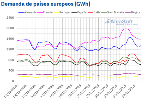 Fuente: Elaborado por AleaSoft Energy Forecasting con datos de ENTSO-E, RTE, REN, Red Eléctrica, TERNA, National Grid y ELIA.