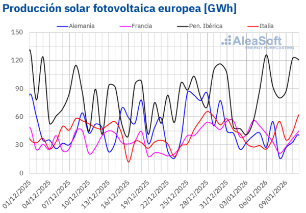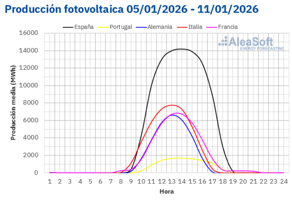 En la semana del 5 de enero, la producción solar fotovoltaica aumentó en los mercados de la península ibérica con respecto a la semana anterior. El mercado español registró el mayor incremento, del 39%, mientras que en el mercado portugués el incremento fue de un 16%. En cambio, los mercados italiano, alemán y francés registraron descensos en la generación con esta tecnología. Italia y Francia anotaron caídas del 8,8% y del 26%, respectivamente, tras dos semanas de aumentos. Por su parte, Alemania acumuló su segunda semana consecutiva de descensos, con una bajada del 23%.