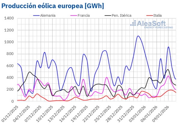 Además, los mercados español e italiano batieron récords históricos de producción eólica. En España, este hito se produjo el viernes 9 de enero, cuando la producción eólica alcanzó los 453 GWh de generación. Un día después, el 10 de enero, la producción eólica en Italia registró 188 GWh de generación. Por su parte, el mercado francés alcanzó su segunda mayor producción eólica de la historia para un día de enero, también el 9 de enero, con una generación de 429 GWh, tras la registrada el 28 de enero de 2025, de 437 GWh.