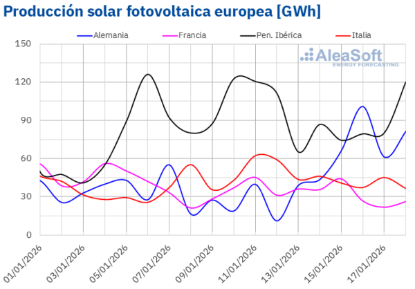 En la tercera semana de enero, la producción solar fotovoltaica aumentó en los mercados de Alemania e Italia con respecto a la semana anterior. El mercado alemán registró el mayor incremento, del 77%, tras dos semanas de descensos, mientras que en el mercado italiano el aumento fue de un 7,1%. En cambio, los mercados de la península ibérica y el mercado francés registraron descensos en la generación con esta tecnología. España y Portugal anotaron caídas del 13% y del 23%, respectivamente, mientras que Francia acumuló su segunda semana consecutiva de descensos, con una bajada del 14%.