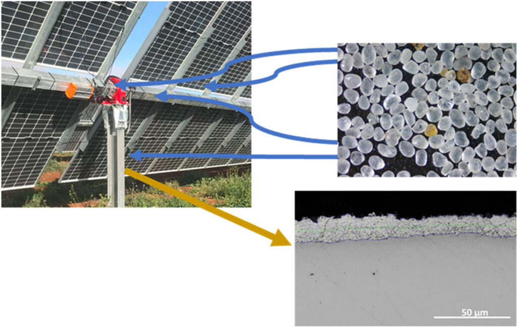 «Aunque la degradación de los paneles fotovoltaicos y la corrosión de los elementos estructurales se han estudiado en profundidad, son escasas las investigaciones que han abordado el impacto específico de la erosión por arena en las estructuras metálicas en entornos desérticos y semidesérticos», afirman los científicos. «En estos entornos, las estructuras de soporte fotovoltaicas están continuamente expuestas a las partículas de arena arrastradas por el viento. La erosión resultante desgasta gradualmente los recubrimientos protectores de zinc del acero galvanizado. Una vez que esta capa se ve comprometida, el acero subyacente se vuelve muy susceptible a la corrosión».