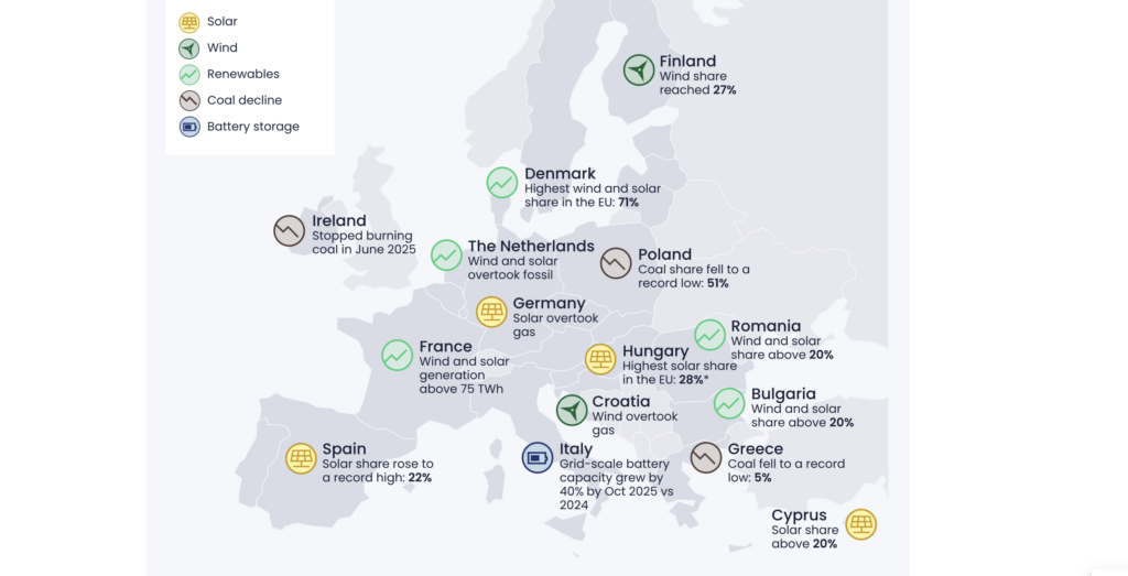 Croacia ve cómo la energía eólica supera al gas.Francia registra una generación eólica y solar superior a 75 TWh.Los Países Bajos ven cómo la energía eólica y solar superan a la generación fósil. Irlanda deja de quemar carbón en junio de 2025. Grecia reduce el carbón a un mínimo histórico del 5 %, mientras que Polonia ve cómo el carbón cae a un mínimo histórico del 51 %. Italia aumenta la capacidad de las baterías a escala de red en un 40 % para octubre de 2025 en comparación con 2024.