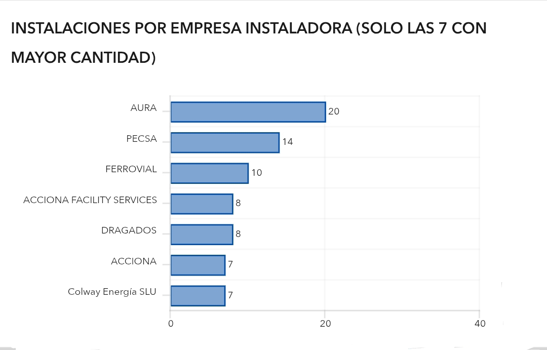 En el ámbito de la ejecución, el mercado ha estado liderado por un grupo reducido de empresas especializadas, donde Aura, con 20 instalaciones, Pecsa, con 14, y Ferrovial con 10, han sido los principales contratistas, configurando la arquitectura técnica de la red municipal actual.