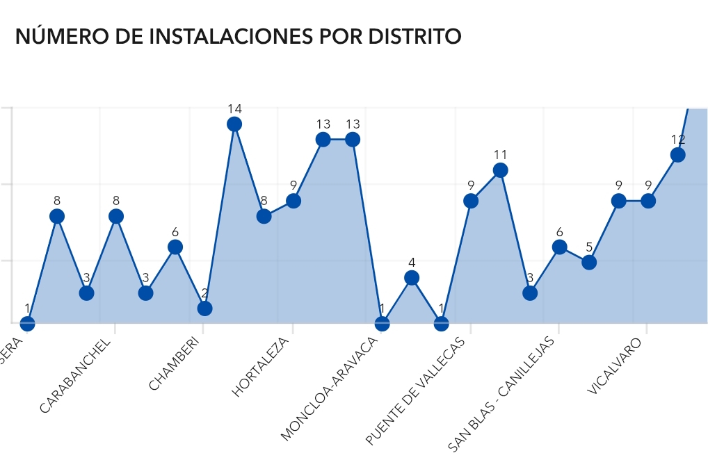 La capilaridad del sistema es desigual en el territorio. Distritos de la periferia y áreas de expansión como Hortaleza (14 instalaciones), Moncloa-Aravaca (13) y Vicálvaro (12) concentran el grueso de la potencia, contrastando con la baja densidad en distritos centrales Chamberí (2 instalaciones) o Retiro (1 instalación).