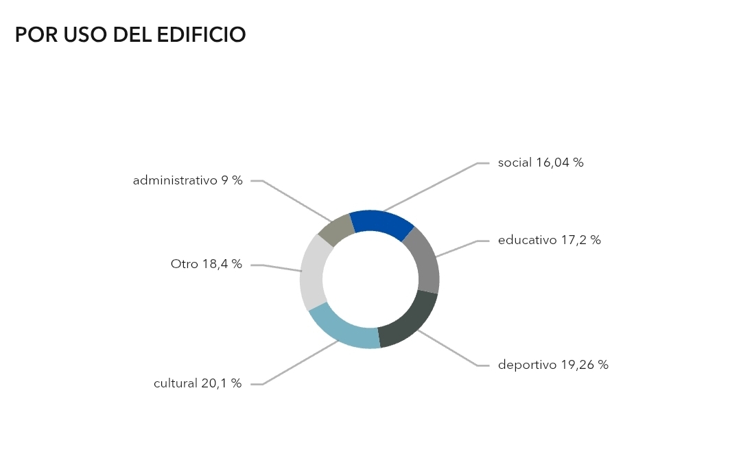 En cuanto al destino de la energía, los edificios deportivos lideran en número de activos (38), pero son los centros culturales los que aportan la mayor cuota de energía al sistema (20,1%), seguidos muy de cerca por los deportivos (19,26%) y educativos (17,2%). Esta distribución sugiere que los edificios culturales poseen cubiertas con mayor superficie o mejor orientación relativa.