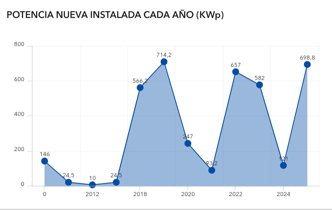 El histórico de altas revela que la estrategia de instalación no ha sido lineal. Tras un periodo de actividad marginal, el ciclo 2018-2019 marcó el cambio de escala técnica, con un pico de 714,2 kWp instalados en un solo año. Aunque los ejercicios posteriores mostraron una ralentización en la incorporación de nueva potencia (con valles pronunciados en 2021 y 2024), el año 2025 ha registrado un fuerte repunte con casi 700 kWp adicionales, lo que indica una reactivación de la inversión en infraestructura de generación.