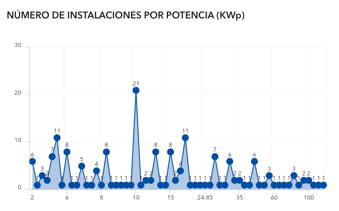 El análisis de la escala de los proyectos indica que la red se basa fundamentalmente en instalaciones de pequeño y mediano formato. El nodo técnico más común es la planta de 10 kWp, que representa el mayor pico de frecuencia en el inventario.