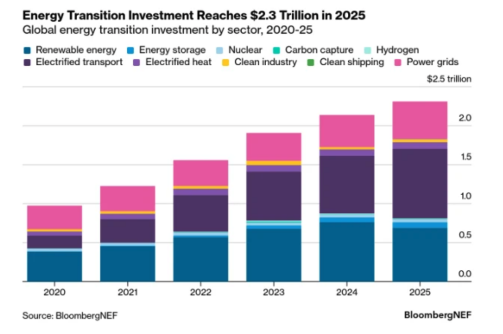 La inversión mundial en la transición energética alcanzó un nuevo máximo histórico en 2025, al situarse en 2,3 billones de dólares, un 8 % más que en 2024, según el informe anual Energy Transition Investment Trends (ETIT) de BloombergNEF (BNEF). El estudio analiza el gasto destinado al despliegue de tecnologías limpias, la inversión en cadenas de suministro de energía limpia, la financiación mediante capital para empresas de tecnología climática y la emisión de deuda vinculada a la transición energética. Pese a un contexto marcado por tensiones geopolíticas y disrupciones comerciales, los cuatro indicadores registraron avances, lo que, según BNEF, confirma la resiliencia estructural de la transición energética global.