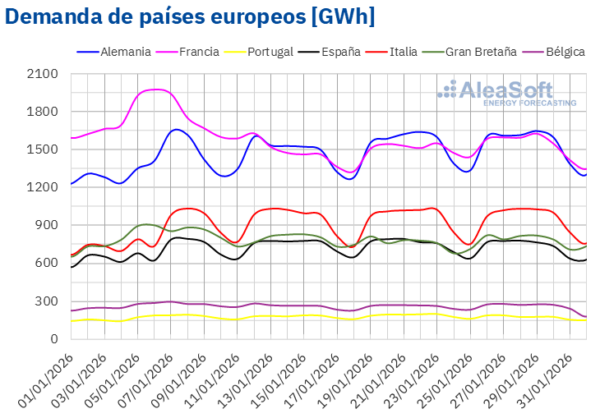 Para la primera semana de febrero, según las previsiones de demanda de AleaSoft Energy Forecasting, la demanda aumentará en los mercados de Gran Bretaña, Bélgica y España. En cambio, los mercados de Alemania, Portugal, Italia y Francia registrarán descensos en la demanda.