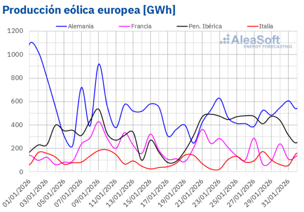 Para la primera semana de febrero, según las previsiones de producción eólica de AleaSoft Energy Forecasting, la producción con esta tecnología aumentará en los mercados de Alemania, Francia y España. Sin embargo, los mercados de Portugal e Italia registrarán descensos.